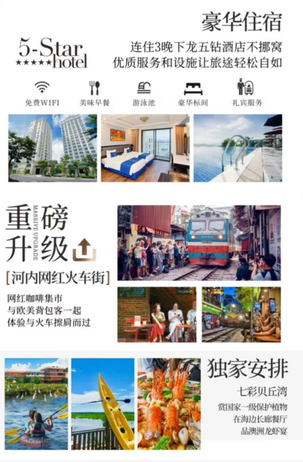 早餐后乘車前往【歐洲小鎮(zhèn) Megagrandworld】-越南河內(nèi)版水上威尼斯(停留參觀約 30 分鐘),是河內(nèi)的新興網(wǎng)紅拍照打卡點,一片五彩斑斕的建筑,就像走進了一幅美麗的油畫中!每座房子都像藝術(shù)品一樣。彩色房子中又包裹著一條小河,小河上還有大帆船,小游船,給這個小鎮(zhèn)又增添了些生動的色彩,街道兩旁還有不少精致的小商店和咖啡館,可以找一家可愛的咖啡店,品嘗一杯越南咖啡,有種身處電影里的高級感! 外觀巴亭廣場:是河內(nèi)人民集會和節(jié)日活動的場所; 外觀胡志明陵:胡志明為越南人民尊敬的國父,每天慕名而來瞻仰的游人不計其數(shù)。 外觀主席府:主席府是一橦極漂亮的法國式建筑,在法屬期間, 曾是法駐印度支那總督居住和辦公的地方; 【軍事博物館】館內(nèi)展示的是以越南近代戰(zhàn)爭為基點的軍事歷史,尤其全方位展示了越戰(zhàn)中北越軍隊和美軍使用過的小型噴火器、炸彈、戰(zhàn)斗機等武器。 前往【還劍湖】,自由漫步還劍湖,還劍湖位于河內(nèi)舊城的中心區(qū),被稱為河內(nèi)第一風景區(qū),這里匯聚著中越法三國的文化氣息,中國的漢字,越南的奧黛,法式的咖啡館和面包,相映成趣,近距離接觸越南街區(qū)文化,更貼越南地氣;走在街上,林蔭大道兩旁有著許多帶有百葉窗和瓦頂?shù)拇u質(zhì)建筑,仿佛向世人講述著這個城市的歷史。 隨后可以乘坐河內(nèi)特色人力【三輪車】(0.5小時);觀賞沿途的風景,乘坐著這種人力三輪車慢悠悠地游覽河內(nèi)古街是您認識河內(nèi)的最佳方式。 打卡【三十六條古街】越南河內(nèi)老街最有名的還是屬三十六街,這如同我們匡內(nèi)的古鎮(zhèn)街道,四通八達又相互交錯。每一條街道都承擔著不同的銷售職能。工藝品一條街、美食一條街、酒吧一條街、服飾一條街.………總之來到三十六街逛上一遍一定能夠滿足一個越南人所有的日常所需和精神世界的享受。這是一條有著歷史又充滿地道煙火氣息的老街區(qū),如果你想要了解越南人的真實生活,逛一下三十六街就會得到答案。 【河內(nèi)大教堂】圣約瑟夫大教堂又名河內(nèi)大教堂,建于1886年的法式風格天主教堂,越南規(guī)模最大最有名的法國天主教堂,同時也是河內(nèi)很具代表性的法式建筑。雖是仿巴黎圣母院而建,但是彌撒開始,心都靜了,你可以選擇距離不遠的小攤,來杯滴漏咖啡,在嘈雜中的享受內(nèi)心的寧靜。 隨后前往網(wǎng)紅打卡地:本地人才知道的河內(nèi)【火車街】。有一條鐵路,穿越河內(nèi)人的前廊,沉浸在人們的生活中。穿越這里的“傳奇”鐵路彎道吸引了眾多國際游客。從它在外國報紙上刊登作為每次來河內(nèi)必去的地方的那一天起,火車附近就非常繁忙。但它的安靜空間并沒有被打破。來自世界各地的游客前來參觀,他們都在“培育”這個村莊,因為這里的人們每天都在保護它。馬路兩旁是一排排房子緊挨在一起,有著可愛的小攤位和茶點咖啡館。當火車緩緩駛過,超近距離感受到火車的轟鳴和力量,體驗與火車“零距離”接觸的驚險與刺激。超驚險的感覺! (溫馨提示:此為贈送項目,如遇交通管制無法進入游覽,不退費用。) 返回酒店休息。 | |||
